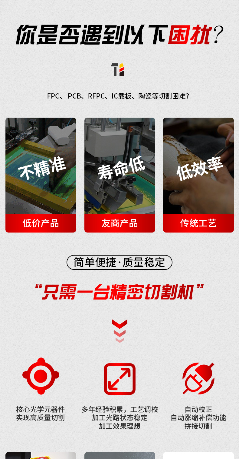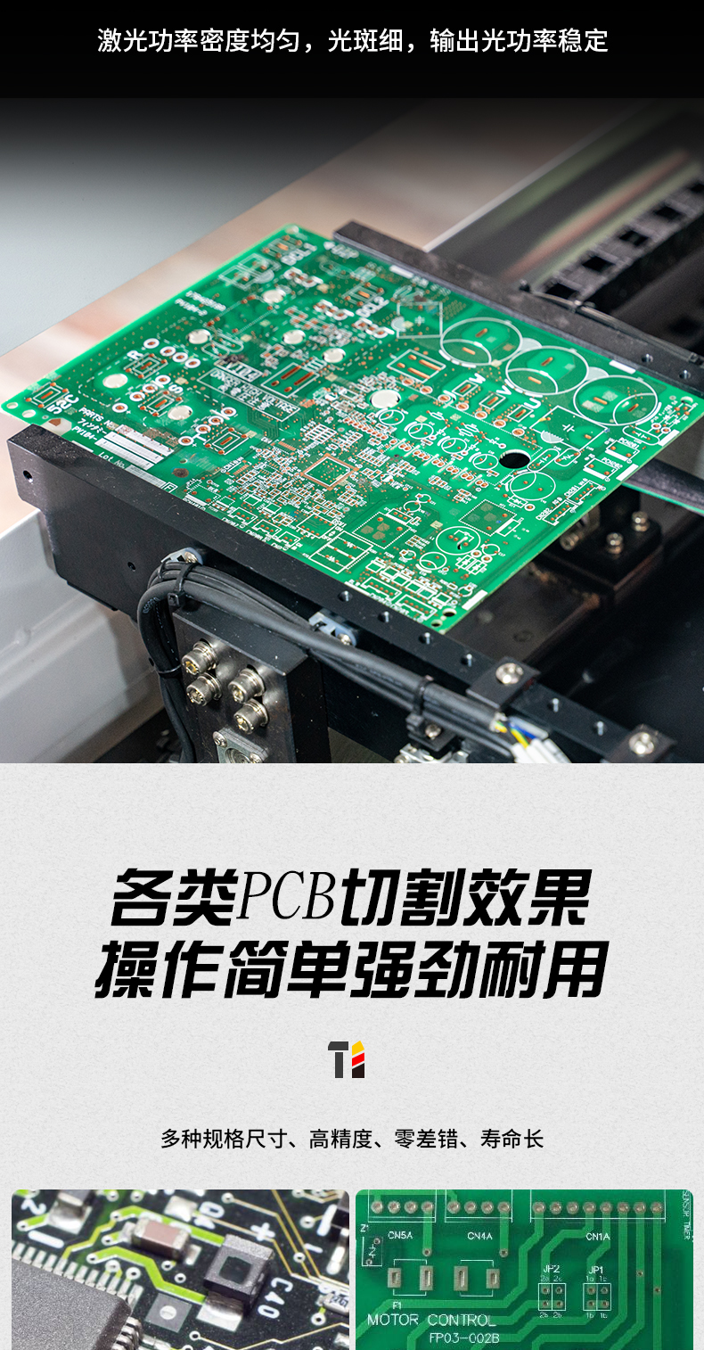 快速將拼板生產的PCB分割成獨立的電路板,加工LTCC,加工半固化片,在FR4上鉆孔、鉆微孔、激光直接成型電路圖形等。紫外激光與其他加工方式或其他激光相比,切割邊緣更整齊,外形尺寸精度更高。產品加工模式無間隙切換,只需點擊軟件菜單導入新加工項目即可。