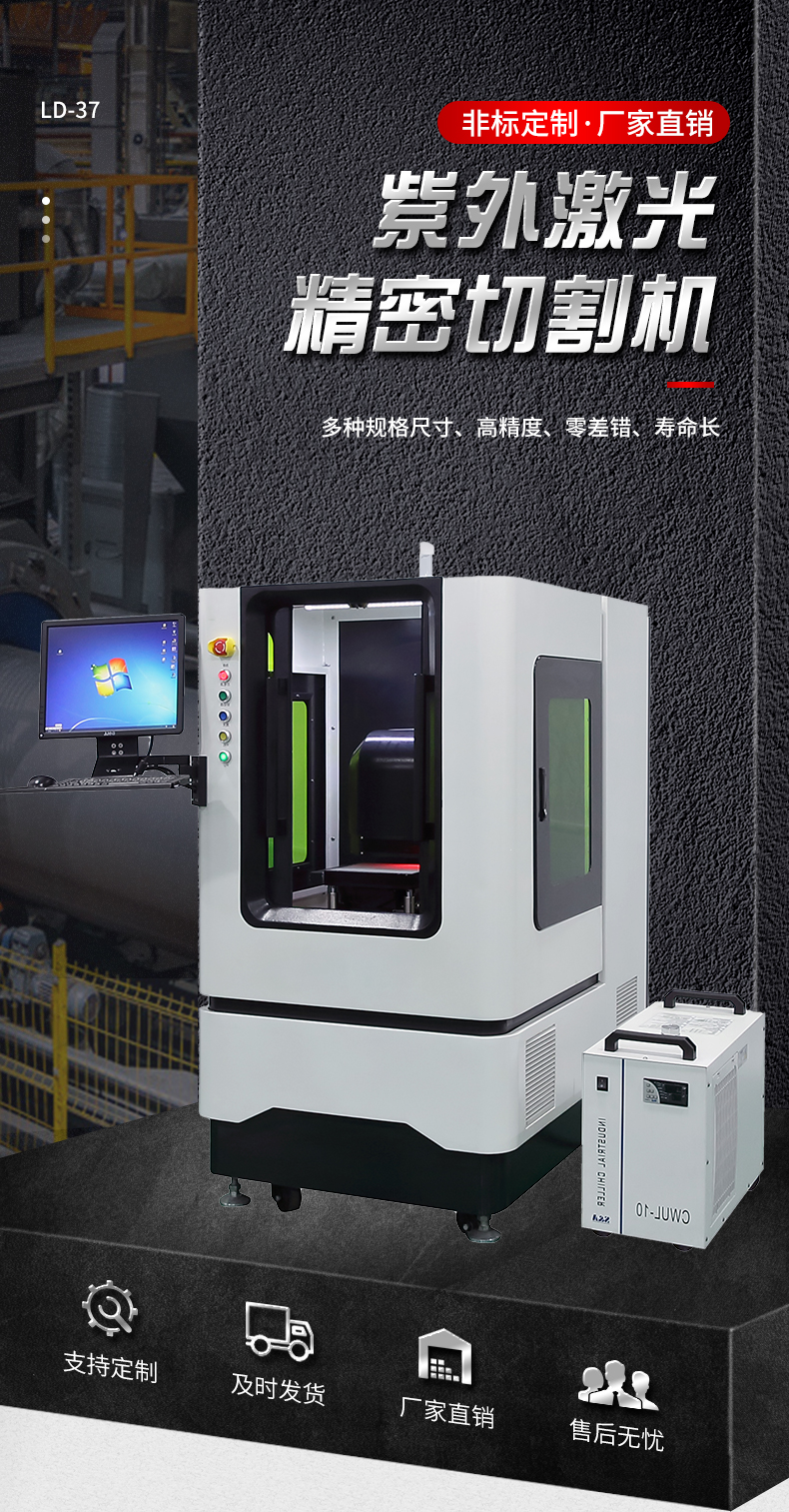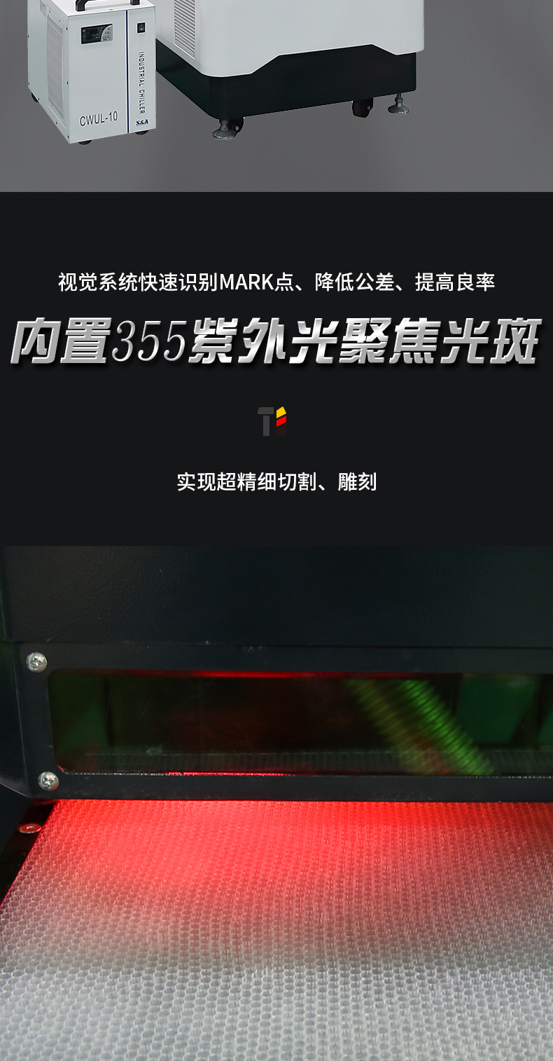 采用UV紫外激光作為工具,冷加工方式,結構緊湊、易安裝、操作簡單,維護方便。幾乎可以加工所有材料,功能強大,精密控制及加工效率極高,是開發創新產品的好幫手。