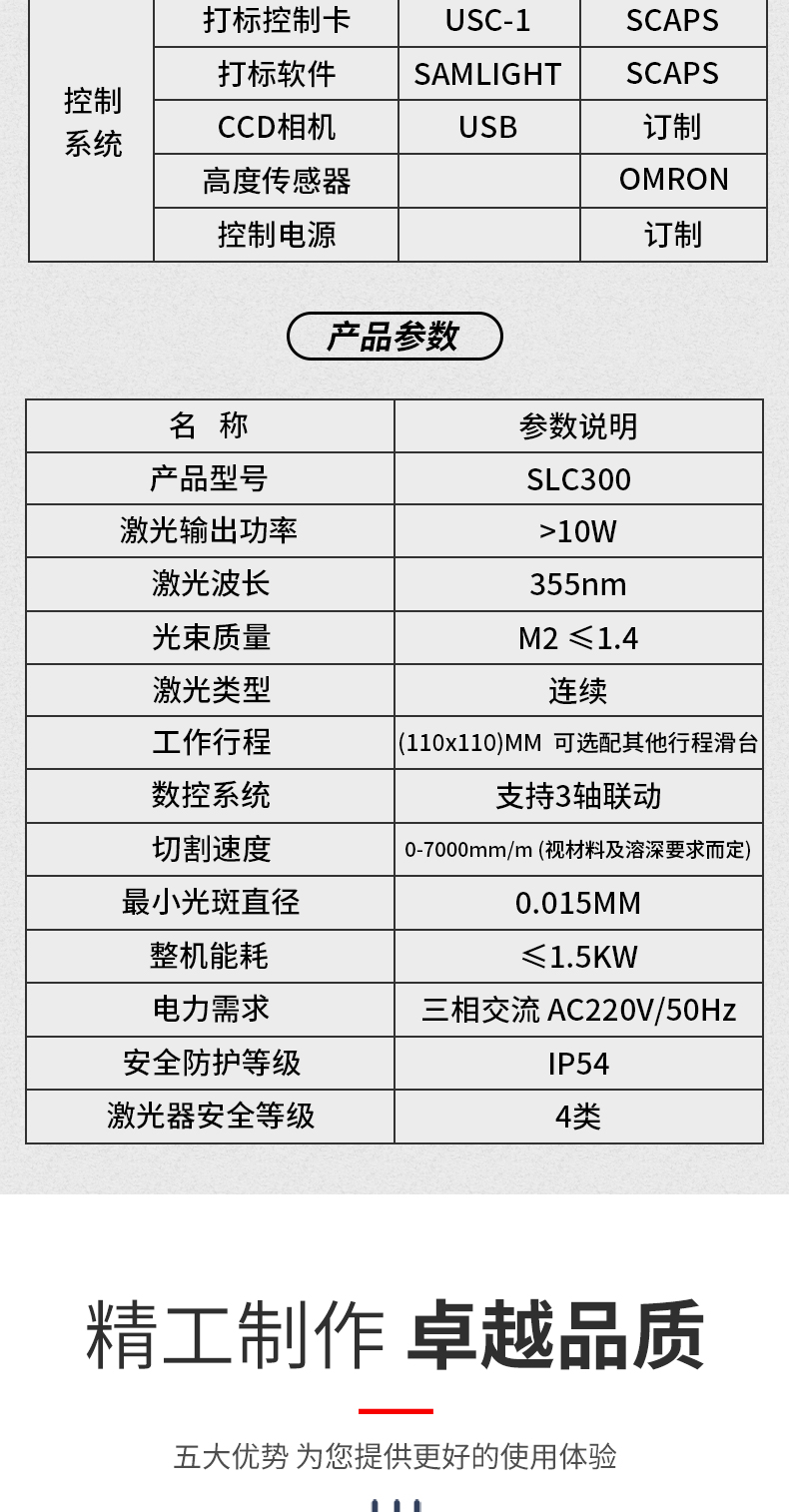 SLC300安裝方便,采用風冷UV紫外激光器,連上吸塵器,介入壓縮空氣,插上電源即可工作 。該設備設計結構緊湊,采用十字滑臺結合CCD視覺運動控制,達到高速運動并自動捕捉定位產品,效率更高,精度更高。自動調焦,是工件永遠處于激光焦點范圍內。集成的真空吸附平臺,包括軟性材料、柔性材料、薄的基材都能平整的固定。
